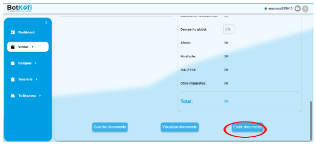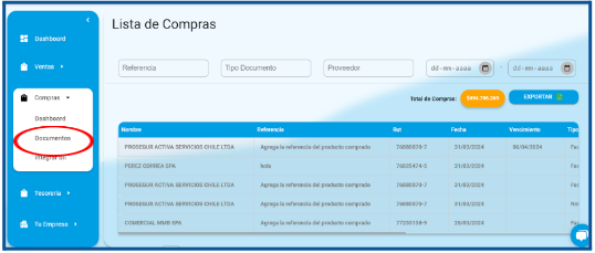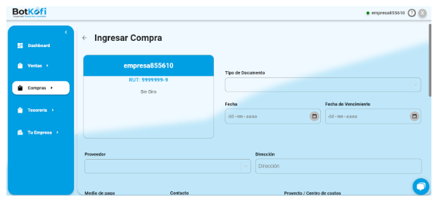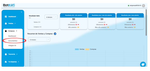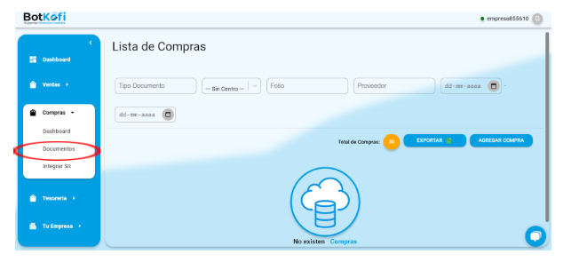 Navega al menú lateral en tu cuenta de Botkofi y selecciona la opción Compras. y luego selecciona Documentos