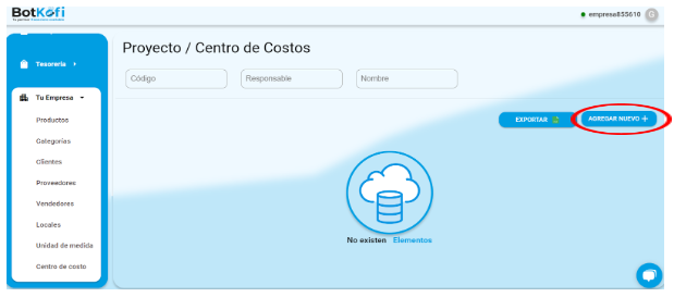 – ➕ Haz clic en «Agregar Nuevo» para comenzar a configurar tu nuevo proyecto o centro de costos.