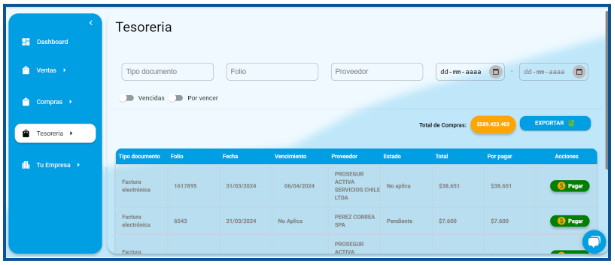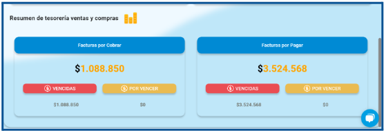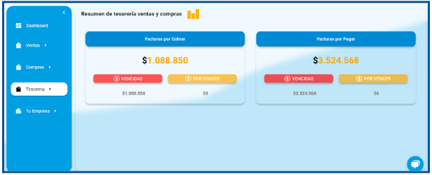Gestión Efectiva: Visualiza un resumen claro de la tesorería, destacando las facturas por cobrar y por pagar, incluyendo montos vencidos y por vencer, lo cual es esencial para la administración financiera óptima.