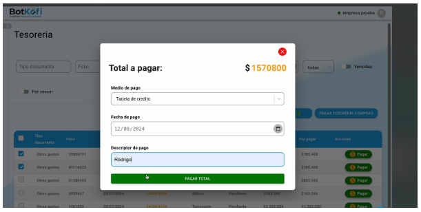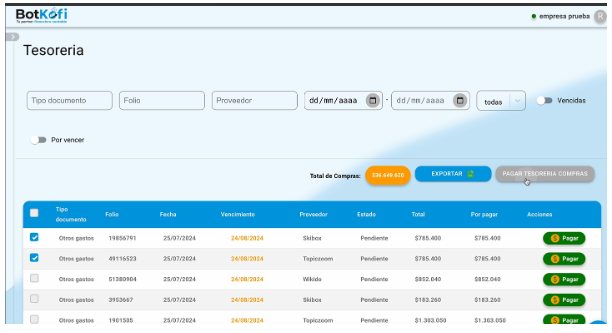 ¡Tenemos excelentes noticias para mejorar la gestión de tus transacciones financieras en Botkofi! Hemos introducido una **nueva funcionalidad** que te permite seleccionar varios ítems simultáneamente usando checkboxes. Esto está diseñado para facilitar y agilizar tus procesos de pago. 🚀