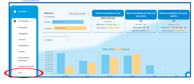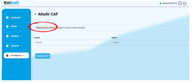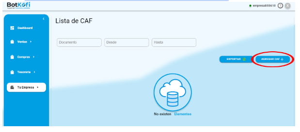 - Busca y Selecciona CAF: Dentro de «Tu Empresa», busca y haz clic en «CAF». Aquí podrás manejar todo lo relacionado con los Códigos de Autorización de Folios.