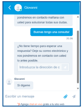 Haz clic en el icono de mensaje 📩 y se abrirá la ventana de chat, permitiéndote escribir y enviar tu consulta de manera inmediata.